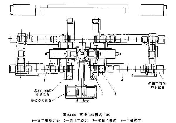 (3) 可換主軸箱式FMC,這種單元以多軸加工為主,適于品種不多的中、大批量的生產(chǎn),加工設(shè)備是可更換主軸箱的組合機(jī)床,單元內(nèi)設(shè)有主軸庫及其運(yùn)輸交換裝置,圖52-58所示為可換箱式FMC。工件通過托板交換裝置,從、外部系統(tǒng)進(jìn)入單元,送上圓形回轉(zhuǎn)工作臺(tái)夾緊,然后由兩側(cè)裝有相應(yīng)主軸箱的動(dòng)力頭驅(qū)動(dòng)加工。