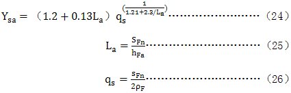 應(yīng)力修正系數(shù)Ysa­是把名義彎曲應(yīng)力轉(zhuǎn)換成齒根應(yīng)力基本值的系數(shù)。它考慮了齒根過渡曲線處的應(yīng)力集中的效應(yīng),以及彎曲應(yīng)力以外的其他應(yīng)力對齒根應(yīng)力的影響(進一步的說明見GB/T3480)。