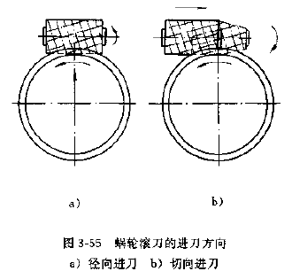 蝸輪滾刀切制蝸輪時,有兩種進刀方法,徑向進刀法和切向進刀法,見圖3-55。