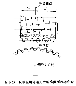 雙導程蝸輪滾刀有三種齒距;理論齒距pxo左側(cè)面齒距pxol和右側(cè)齒面齒距pxor,見圖3-58。滾刀全長上各個刀齒的齒厚由一端向另一端逐漸增大,其中有一個刀齒的齒厚等于標準值,稱此刀齒為標準齒,通過標準齒中線的截面,稱為標準截面見圖3-59。標準齒和標準截面是制造滾刀時控制齒厚的依據(jù),也是加工蝸輪時的對刀基準。