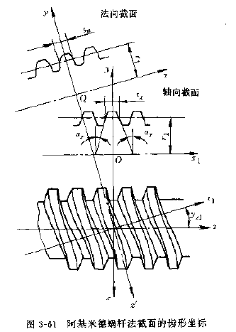 阿基米德蝸桿的法向截形方程,可按圖3-61所示的坐標關系,由阿基米德螺旋面的基本方程轉(zhuǎn)換求得。
