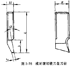 成對(duì)滾切銑刀盤(pán)切齒時(shí),兩把銑刀盤(pán)在工件的同一齒槽內(nèi)工作,一把切削左齒面,另一把切削右齒面,切齒時(shí)有展成運(yùn)動(dòng),銑刀盤(pán)工作側(cè)刃與銑刀端面之間通常作出一個(gè)角,使產(chǎn)形輪的齒面成為一個(gè)凹錐面,因此切出的齒輪齒長(zhǎng)方向呈中鼓形,有利于嚙合,根據(jù)使用機(jī)床的不同,銑刀盤(pán)的直徑有150。270及600mm,其中以直徑為600mm的銑刀盤(pán)應(yīng)用最廣。刀齒的凹入角δ有1°30′、2°30′和5°三種,常用的成對(duì)滾切銑刀盤(pán)刀齒的尺寸見(jiàn)圖3-76和表3-149~表3-151。