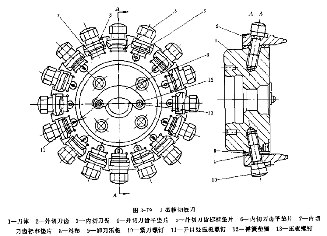全工序雙面銑刀按雙螺旋切削法或者成形法加工弧齒錐齒輪和準雙曲面齒輪副中的大、小齒輪。全工序法加工大、小齒輪分別只用一把銑刀;適用于多品種、小批量生產(chǎn),該銑刀結(jié)構(gòu)與Ⅲ型精切銑刀基本相同,只適用于進口格里森機床或新型仿制機床上,其公稱直徑有英制和米制兩個系列,英制有5,6,7.5,9,10.5,12,14,16in等八種,米制有100,125,160,200,250,320,400,500mm等八種,結(jié)構(gòu)型式和基本尺寸見圖3-79~圖3-80和表3-165~表3-166。
