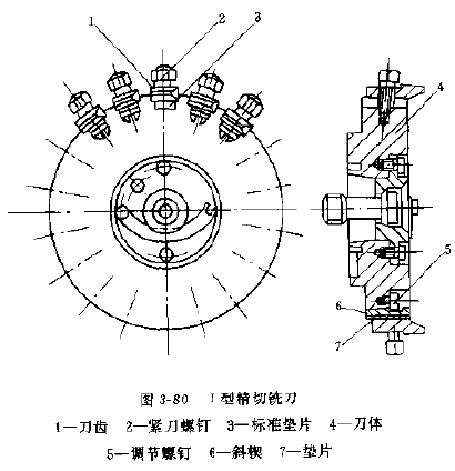 2.4.4.4Ⅱ型銑刀與Ⅰ型精切銑刀的結(jié)構(gòu)型式基本相同,只是刀體外圓直徑比Ⅰ型銑刀小,用墊片調(diào)整的參數(shù)范圍也小。該型銑刀已很少使用,它只能用在進口格里森機床或新型仿制機床上,其標(biāo)稱直徑有5,6,7.5,9,12in等五種,結(jié)構(gòu)型式和基本尺寸見圖3-79~圖3-80和表3-159~表3-161。