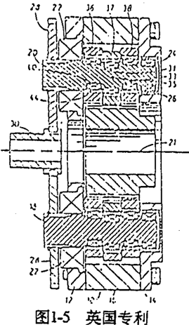 雙曲柄機(jī)構(gòu)中,如果在兩根曲軸上都有動(dòng)力輸入,則“死點(diǎn)”位置也就自然不存在了。因此,可以通過(guò)一套定軸傳動(dòng)機(jī)構(gòu)把動(dòng)力從一輸入高速軸傳遞到另一高速軸,從而克服機(jī)構(gòu)“死點(diǎn)”。根據(jù)這種原理制成的雙曲柄輸入少齒差行星齒輪裝置之不理的類(lèi)型很多,如太原工學(xué)院五十年代研制的雙曲柄輸入漸開(kāi)線(xiàn)少齒差減速器(見(jiàn)圖1-4)、英國(guó)專(zhuān)利(見(jiàn)圖1-5)、、重慶鋼鐵公司研制的單齒環(huán)雙曲柄輸入少齒差減速器(見(jiàn)圖1-6)、日本松本和幸等人研制的RV減速器(見(jiàn)圖1-7)。其特點(diǎn)都是通過(guò)外嚙合齒輪副將輸入動(dòng)力分流、傳遞到多個(gè)曲柄軸上,形式多軸輸入,從而克服“死點(diǎn)”。這種結(jié)構(gòu)的特點(diǎn)是其傳動(dòng)比為定軸傳動(dòng)的傳動(dòng)比與少齒差行星齒輪傳動(dòng)的傳動(dòng)比之乘積,因而可以通過(guò)改變外嚙合齒輪的齒數(shù)方便函地滿(mǎn)足不同傳動(dòng)比的要求,適應(yīng)性強(qiáng)。其不足之處是結(jié)構(gòu)復(fù)雜,而且在高速軸之間存在兩平行傳動(dòng)的剛性傳動(dòng)鏈(外齒輪嚙合副和雙曲柄機(jī)構(gòu))對(duì)誤差比較敏感,加工精度要求很高。