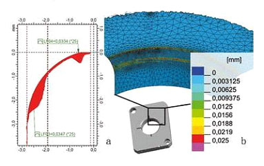 圖3 材料配對(duì)DC05-GS60:在25000次升程后 凹模入口半徑節(jié)拍式輪廓測(cè)量(a)和Redsy(b)磨損模擬結(jié)果