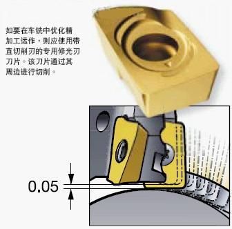 就粗加工工序而言,車(chē)銑不需要專(zhuān)用刀具;但若要優(yōu)化精加工工序,則應(yīng)使用專(zhuān)用的標(biāo)準(zhǔn)修光刃可轉(zhuǎn)位刀片。要使輕微的表面形狀偏差變圓滑,需要使用直的修光刃刀刃,而非用于一般銑削的常規(guī)弧形刀刃。在車(chē)銑運(yùn)動(dòng)中,切削點(diǎn)沿著生成表面的切削刃前后移動(dòng),而這意味著弧形刀刃可在直徑上造成更多的高度變化,從而加大扇形深度。