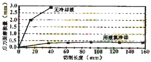 在車(chē)刀前刀面上倒裝了個(gè)金屬帽狀物,其內(nèi)腔與刀片的上表面共同組成一個(gè)密閉室。帽狀物上有液氮的入口和出口。在干切削過(guò)程中,液氮不斷在密閉室中流動(dòng),吸收刀片上的切削熱,使刀具不產(chǎn)生過(guò)高的溫升.始終保持良好的切削性能,順利實(shí)現(xiàn)干切削。圖4是用PCBN刀具加工RBSN工件材料時(shí)刀具磨損量的實(shí)驗(yàn)結(jié)果。在不使用液氮冷卻刀具時(shí)PCBN刀具車(chē)削長(zhǎng)度僅40mm,后刀面磨損量便高達(dá)3mm,切削無(wú)法再進(jìn)行下去。采用上述液氮裝置后,刀具磨損情況大為改善,車(chē)削長(zhǎng)度160mm后,后刀面僅磨損0.4mm。被加上工件的圓度誤差也從20μm減至3.2μm。液氮是一種很容易獲得的原料價(jià)格便宜還可以反復(fù)使用。