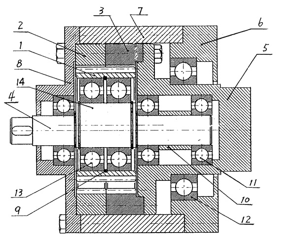 | 一種變位齒減速機(jī),它具有一個(gè)偏心固定在輸入軸(4)上的齒圈(1)和一個(gè)與之行星嚙合的定齒輪(2),其特征是與定齒輪(2)同心且并排設(shè)置一與定齒輪(2)存在齒數(shù)差的動(dòng)齒輪(3),齒圈(1)同時(shí)與定齒輪(2)和動(dòng)齒輪(3)嚙合。 |