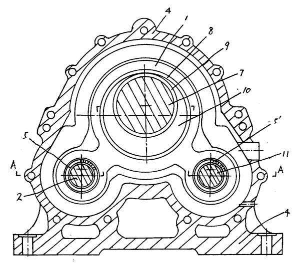 | 一種三擺葉減速機(jī),包括機(jī)殼(4)及安裝在機(jī)殼上的輸入軸(2)與輸出軸(7),在機(jī)殼內(nèi)為傳動(dòng)機(jī)構(gòu),其特征是輸出軸(7)位于機(jī)殼內(nèi)的部分為帶有外齒(9)的齒輪軸,輸入軸(2)位于機(jī)殼內(nèi)的部分為3段偏心量e分別相等的偏心軸,3段偏心軸的偏心方向互呈120°分布,在機(jī)殼上以輸入軸(7)的齒輪軸為中心、左右對(duì)稱地安裝偏心量及偏心方向與輸入軸(2)的偏心軸一一對(duì)應(yīng)的被動(dòng)軸(11),傳動(dòng)機(jī)構(gòu)中有結(jié)構(gòu)相同的3片擺葉(1),該擺葉(1)的上部有內(nèi)齒(8),下部對(duì)稱地安裝兩個(gè)軸承(5),其中,內(nèi)齒(8)套在輸出軸(7)的外齒(9)上,內(nèi)齒(8)的直徑大于外齒(9),在內(nèi)、外齒間有空隙(10),兩個(gè)軸承(5)的內(nèi)孔分別與輸入軸(2)和被動(dòng)軸(11)上的偏心軸聯(lián)接,將3片擺葉分別依次聯(lián)接在3段偏心軸上。 |