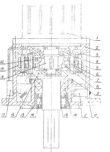 一種釜用不泄漏減速機(jī),由擺線輪[8]、輸入軸[18]、偏心軸承[20]、機(jī)座[10]、針齒輪及W輸出機(jī)構(gòu)組成,其中針齒輪由針齒殼[19],均布在針齒殼上的針齒[7]構(gòu)成,W機(jī)構(gòu)由輸出軸[16]與均布在輸出軸圓盤上的柱銷[6]及柱套[5]構(gòu)成,其特征在于: a)機(jī)座[10]內(nèi)有一儲(chǔ)油腔,機(jī)座外壁有一油泵[17]用來將儲(chǔ)油腔的潤滑油泵至減速機(jī)頂端由上而下對(duì)機(jī)件進(jìn)行潤滑; b)在輸出軸支承軸承[12]頂端有一圓環(huán)蓋[9],其高度高于儲(chǔ)油面1~3cm,用以防止從沿輸出軸漏油; c)在輸出軸軸承[12]下端有一個(gè)密封組件,它由套筒[15]及裝在套筒內(nèi)的密封[13]、[14]構(gòu)成,二密封之間要有一定空間,密封組件用以防止有毒介質(zhì)從反應(yīng)釜中泄漏到減速機(jī)內(nèi)腔。