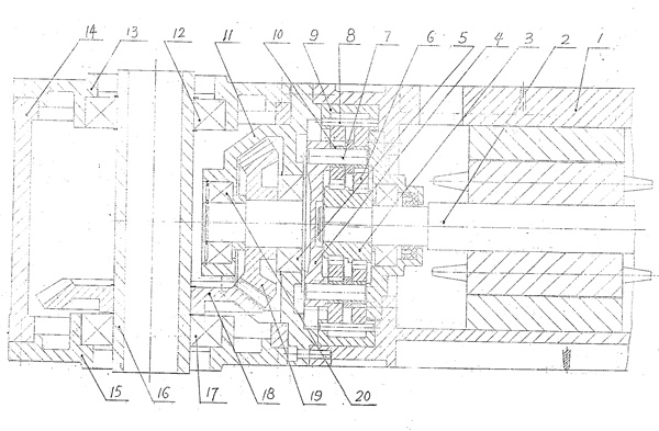 | 一種直角式減速機(jī),其特征在于由電機(jī)直聯(lián)式擺線減速機(jī)及錐齒輪兩級(jí)減速構(gòu)成,其中擺線減速機(jī)由機(jī)座[1]、輸入軸[2]、偏心軸承[3]、輸出軸[4]、擺線輪[6]、柱銷[7]、柱套[10]、針齒銷[8]、針齒殼[9]、端蓋[11]組成,輸出軸由軸承[5]與[20]支承在端蓋內(nèi)孔中,主動(dòng)錐齒輪[19]裝在輸出軸[4]的前端,從動(dòng)錐齒輪[18]與軸[16]聯(lián)接一體,軸的兩端分別用軸承[12]、[17]支承在與箱體兩端聯(lián)接的端蓋[13]與[15]上,軸[16]可以是實(shí)軸,亦可以是空心軸,亦可以是帶法蘭的軸; |