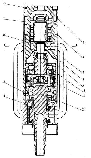 一種旁流式水渦輪減速機,其上部外接高壓水系統(tǒng),殼體內上部的高壓腔內設置渦輪(6),殼體下部的低壓腔內設置減速機構(11),其特征是:設置高壓水導流管(7),導流管(7)上端連通在渦輪下部,下端連通輸出軸(12)的出水口。