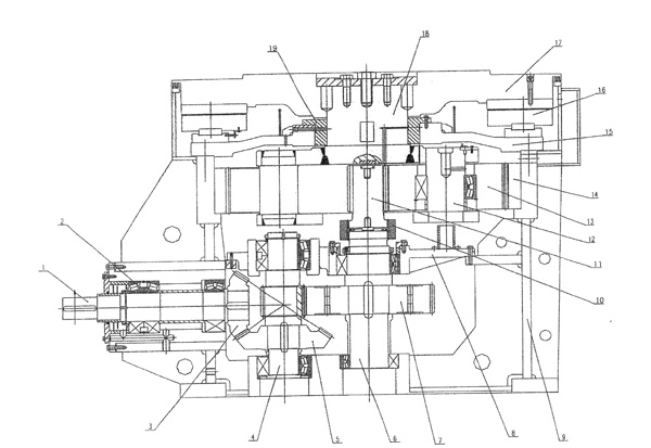 | 本實(shí)用新型涉及一種立式減速機(jī)。包括克林根堡錐齒輪副或格利森齒輪副和行星輪減速傳動(dòng)機(jī)構(gòu),輸入軸上設(shè)有主動(dòng)克林根堡錐齒輪或格利森齒輪,主動(dòng)克林根堡錐齒輪或格利森齒輪與被動(dòng)克林根堡錐齒輪或格利森齒輪嚙合,被動(dòng)克林根堡錐齒輪或格利森齒輪設(shè)在有小齒輪的齒輪軸上,齒輪軸上的小齒輪與固定設(shè)在被動(dòng)軸上的大齒輪嚙合,被動(dòng)軸通過(guò)聯(lián)接內(nèi)齒套與太陽(yáng)輪連接,行星輪通過(guò)行星輪軸均勻分布于行星架上,行星輪同時(shí)與太陽(yáng)輪和設(shè)在箱體上的內(nèi)齒圈嚙合,行星架的軸與輸出法蘭相連。其優(yōu)點(diǎn)在于:在減小克林根堡錐齒輪或格利森齒輪直徑的同時(shí),提高了減速機(jī)的速比和功率,降低了立式減速機(jī)的生產(chǎn)成本。 |