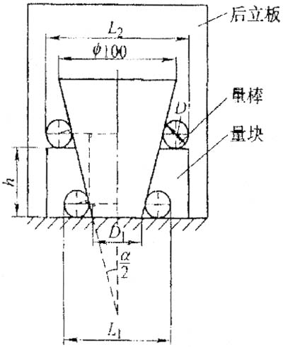 。2)將兩只量棒拿開,用兩塊高h(yuǎn)=60mm的長(zhǎng)方體量塊放在平臺(tái)上,且上端內(nèi)側(cè)與被測(cè)錐軸緊貼,后端面頂住后立板。將兩只量棒分別放在兩量塊的大方,且內(nèi)側(cè)與被測(cè)圓錐軸緊貼,后端頂住后立板,測(cè)出L2=163.19mm。則所測(cè)錐軸的錐度為: