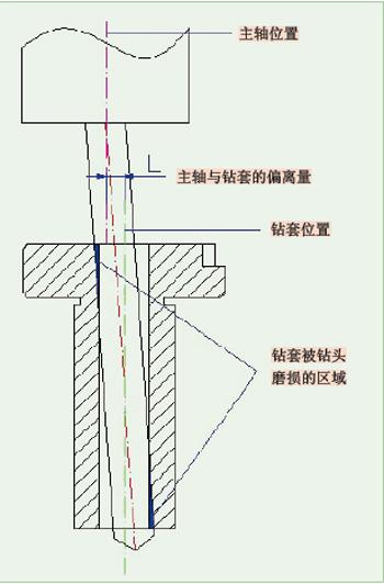 當鉆套位置與主軸位置的同軸度較差時,鉆頭刀具加工一段時間以后會導致鉆套進、出口處的相對位置的局部磨損。如圖4所示,由于鉆頭刀具與鉆套不同軸,所以鉆頭在進入鉆套時就碰到了左邊的孔壁,這樣導致鉆頭的直線度變化。而鉆頭在繼續(xù)進給時,由于鉆頭與鉆套的配合間隙,又造成鉆頭在鉆套的出口處碰到鉆套的右邊,這樣加工中不僅僅是加工孔的垂直度不好,使用時間一長還導致鉆套的進出口孔壁出現(xiàn)相對的孔壁位置磨損。這種現(xiàn)象開始的時候加工孔還在工藝允許要求范圍之內(nèi),但是時間一久,加工孔的位置度就會出現(xiàn)超差現(xiàn)象,因此,只能采用更換鉆套的方法來滿足加工孔的位置度要求。