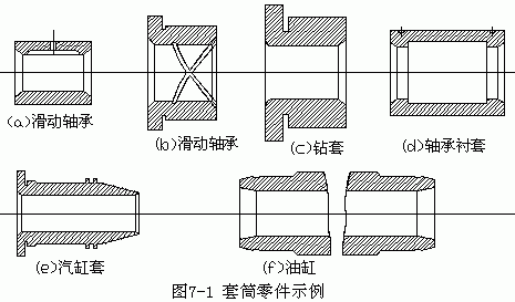 套筒類零件是機(jī)械中常見的一種零件,它的應(yīng)用范圍很廣。如支承旋轉(zhuǎn)軸的各種形式的滑動軸承、夾具上引導(dǎo)刀具的導(dǎo)向套、內(nèi)燃機(jī)氣缸套、液壓系統(tǒng)中的液壓缸以及一般用途的套筒,如圖 7 - 1 所示。由于其功用不同,套筒類零件的結(jié)構(gòu)和尺寸有著很大的差別,但其結(jié)構(gòu)上仍有共同點(diǎn),即:零件的主要表面為同軸度要求較高的內(nèi)外圓表面;零件壁的厚度較薄且易變形;零件長度一般大于直徑等。