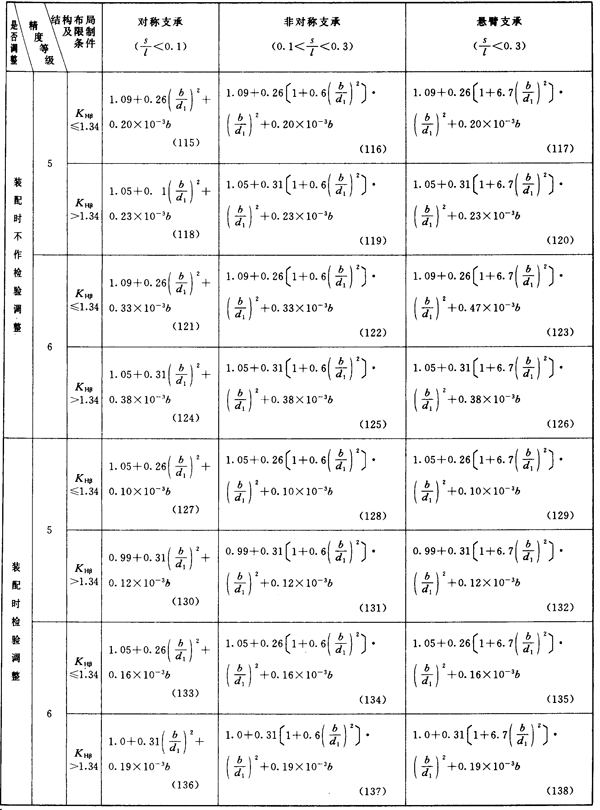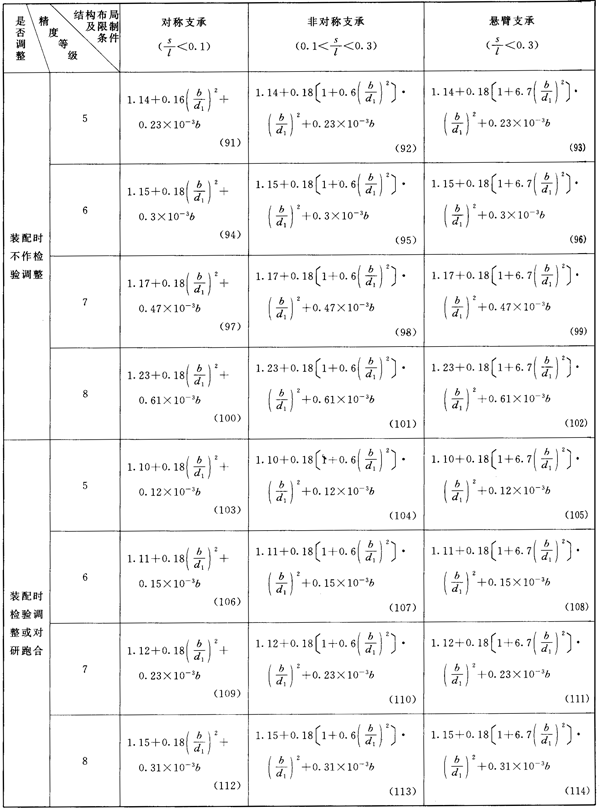 齒輪第Ⅲ公差組精度為5~8級(jí)(硬齒面為5~6級(jí))及相應(yīng)的結(jié)構(gòu)布局限制條件的KHβ簡(jiǎn)化計(jì)算公式見表14或表15。