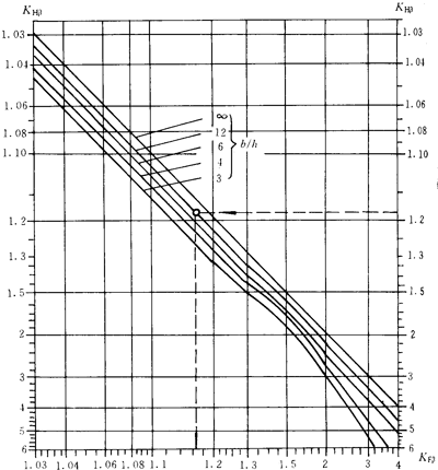 齒向載荷分布系數(shù)KFβ是考慮沿齒寬載荷分布對(duì)齒根彎曲應(yīng)力的影響。對(duì)于所有的實(shí)際應(yīng)用范圍,KFβ可按下式計(jì)算: