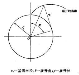 平面沿著一個(gè)固定的圓柱(基圓柱)作純滾動(dòng)時(shí),該平面上一條定直線(發(fā)生線)所展成的軌跡稱為圓柱的漸開(kāi)線齒面。基圓柱被垂直于軸線的平面所截的圓稱為基圓,基圓半徑以rb表示;漸開(kāi)線齒面被垂直于基圓柱軸線的平面所截的曲線稱為漸開(kāi)線齒廓(見(jiàn)圖2)。
