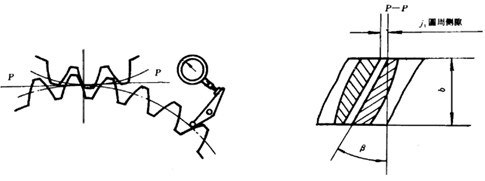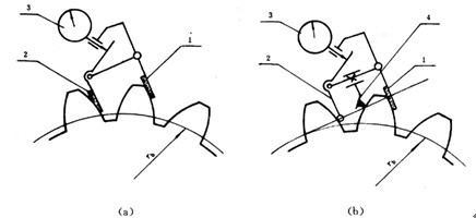 單點(diǎn)法測量法向側(cè)隙的原理參見圖45。單點(diǎn)測量法向側(cè)隙時(shí):在中心距和使用時(shí)中心距相同的情況下,可用測片或塞片進(jìn)行測量。也可和測量圓周側(cè)隙相似使用百分表,但要將百分表測頭放置在與齒面垂直的方向上,此時(shí)從百分表上讀出的晃動量即為法向側(cè)隙值。