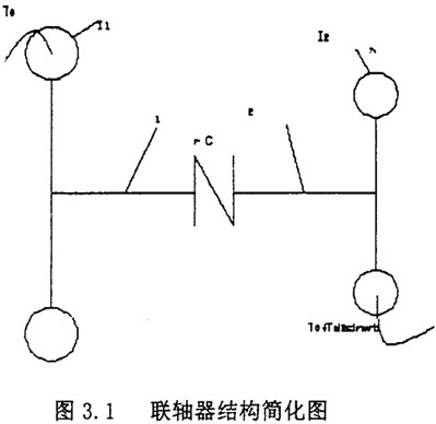 為了便于求解運(yùn)動(dòng)微分方程,需要對(duì)傳動(dòng)軸系中聯(lián)軸器的主動(dòng)和從動(dòng)兩側(cè)的轉(zhuǎn)動(dòng)慣量和剛度作力學(xué)模型的簡(jiǎn)化。根據(jù)具體結(jié)構(gòu)情況,可以將軸系簡(jiǎn)化為若干個(gè)等效轉(zhuǎn)動(dòng)慣量圓盤,以具有某一剛度的周聯(lián)系起來。通常比較典型的是簡(jiǎn)化為兩個(gè)等效的圓盤,配置在聯(lián)軸器的兩側(cè)。并設(shè)定所聯(lián)兩軸的剛性很大,只有聯(lián)軸器具有彈性和阻尼。如圖3.1所示