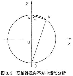 (2)當(dāng)轉(zhuǎn)子軸線之間存在徑向位移時(shí)(如圖3.3所示),聯(lián)軸器的中間套齒與半聯(lián)軸器組成移動(dòng)副,不能相對(duì)轉(zhuǎn)動(dòng),但是中間套齒與半聯(lián)軸器產(chǎn)生相對(duì)滑動(dòng)而作平面圓周運(yùn)動(dòng),即中間套齒的中心是沿著以徑向位移△y為直徑作圓周運(yùn)動(dòng),如圖3.4所示。