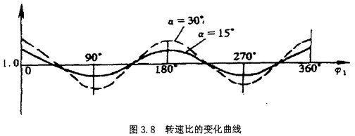 (3)當(dāng)轉(zhuǎn)子軸線之間存在偏角位移時(shí)(如圖3.6),從動(dòng)轉(zhuǎn)子的角速度與主動(dòng)轉(zhuǎn)子角速度是不同的,從動(dòng)轉(zhuǎn)子的角速度為