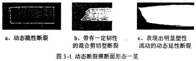 圖3-2顯示了DBF和DDF的形貌特征。從圖中看出動態(tài)延性斷裂相比于脆性斷裂具有速度較低,裂紋擴展途徑比較單一,能自行止裂等特點。由于脆性斷裂已被廣泛遏止,近二十年來,人們把注意力主要集中在延性斷裂的起裂擴展和止裂上,對延性斷裂的關(guān)注遠超過對脆性斷裂的研究,目前還遠未結(jié)束。管線鋼動態(tài)斷裂韌性的測定也就成為了人們關(guān)注的焦點。