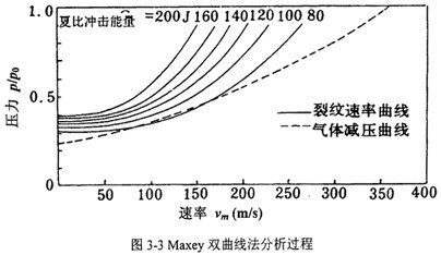 雙曲線法的具體分析過程如圖3-3所示,坐標橫軸表示速度,縱軸表示氣體壓力或環(huán)向應(yīng)力。上方的一組曲線表征不同韌性水平下的斷裂速度,是內(nèi)壓或環(huán)向應(yīng)力的函數(shù)。隨著內(nèi)壓或環(huán)向應(yīng)力在斷裂過程中的減小,斷裂速度不斷降低。如果壓力或應(yīng)力足夠低,斷裂速度即減小到零而發(fā)生止裂。