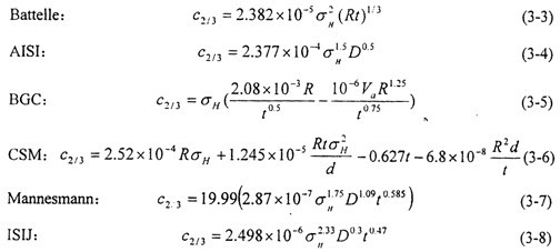 在雙曲線法的基礎(chǔ)上,結(jié)合大量的實驗結(jié)果對止裂韌性進行標定,世界各大研究機構(gòu)分別給出了簡便易算的經(jīng)驗公式用以估算臨界止裂韌性,列舉如下: