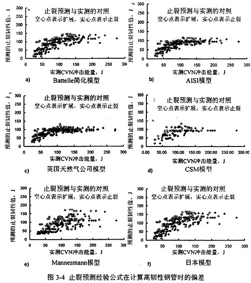 圖3-4表示了Battelle應(yīng)用Maxey雙曲線法對全尺寸實驗數(shù)據(jù)庫所做的DDF止裂韌性預測,圖3-4a至圖3-4f分別對應(yīng)于式(3-3)至式(3-8)。圖中顯示的實驗用管的鋼級包括X52到Xl00,管徑范圍從4O6mm到1422mm,實驗最高壓力超過16MPa?梢,預測模型在管材韌性低于某一水平時預測結(jié)果與實物實驗結(jié)果基本吻合,但當管材韌性較高時出現(xiàn)明顯偏差,預測應(yīng)該止裂的管線沒有止裂。經(jīng)典的止裂預測模型在預測夏比能量值高于94J的管材時,已經(jīng)偏于危險,即過高估計了管材的止裂性能。