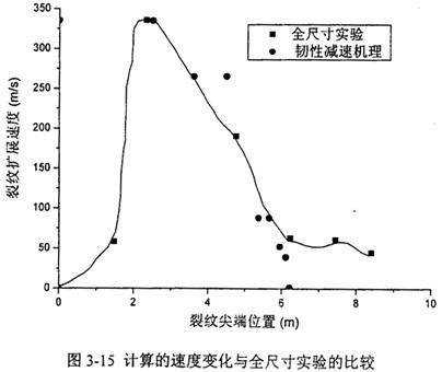 本文通過上述方法,對圖3-9至圖3-12中的全尺寸實測斷裂速度曲線結(jié)果進行了校核,得到了比較吻合的結(jié)果,F(xiàn)以聯(lián)盟管道第一次實驗IE段為例,設(shè)定擴展的初速度為330m/s,速度變化的計算值同實驗對比如圖3-15所示: