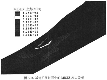 根據(jù)圖3-16中的MISES應(yīng)力分布可以判斷裂尖處的塑性區(qū)范圍。隨著裂紋擴展過程中韌性導致的速度降低,塑性區(qū)的范圍逐漸縮小。
