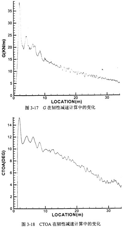 圖3-17和圖3-18是針對西氣東輸某特定設(shè)計參數(shù)的管線,應(yīng)用韌性減速機理計算時能量釋放率G和裂紋尖端張開角CTOA的變化。