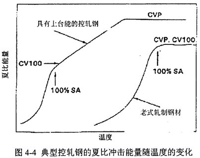 對于斷口上有分離的材料,隨溫度的升高,分離將最終消失,這是因?yàn)轳R氏體和貝氏體帶也達(dá)到了上平臺(tái)溫度。圖4-4表示典型控軋鋼的夏比能量隨溫度的變化。夏比沖擊試樣上100%剪切面積對應(yīng)的最小夏比能稱為CV100。當(dāng)所有的分離都消失時(shí),上平臺(tái)能CVP出現(xiàn),其大小可能高于CV100。