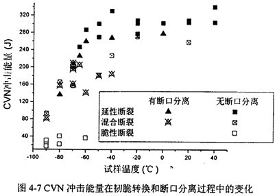 圖4-7選擇的管線鋼在實(shí)驗(yàn)溫度范圍內(nèi)同時(shí)經(jīng)歷了韌脆轉(zhuǎn)化和斷口分離,對上述結(jié)論給予了證實(shí),并可以看到發(fā)斷口分離的試件的韌性稍低于未發(fā)生斷口分離的試件。