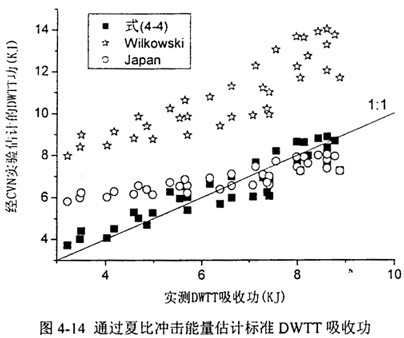 圖4-14將(4.2)~(4.4)式預(yù)測的對應(yīng)關(guān)系同真實(shí)實(shí)驗(yàn)結(jié)果做了對比?梢钥吹綄τ谙嘟腃VN韌性預(yù)測結(jié)果,實(shí)際的DWTT功從低到高在大范圍內(nèi)分布。