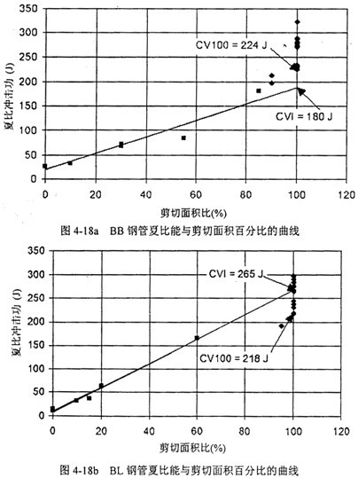 圖4-18a,b,c給出了三家鋼管的夏比能與剪切面積的關(guān)系,以及85%剪切面積對應(yīng)的轉(zhuǎn)變溫度。圖中CV100表示100%剪切面積時(shí)最低的夏比能,CVI表示最低夏比平臺(tái)能,也稱夏比轉(zhuǎn)變能,CVP表示夏比平臺(tái)能。菱形實(shí)驗(yàn)點(diǎn)表示剪切面積高于90%,方形實(shí)驗(yàn)點(diǎn)表示低于90%可以看到,剪切面積低于90%時(shí),夏比能與剪切面積呈線性關(guān)系。