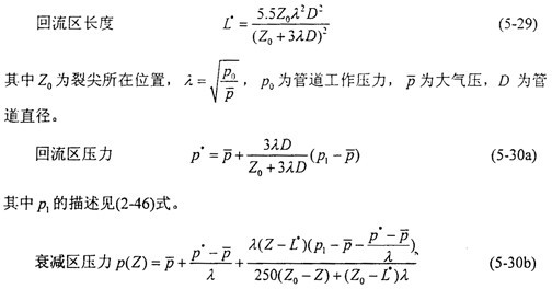 其三是衰減區(qū)的壓力變化。氣流通過裂紋尖端時,管壁上作用的氣體壓力沿軸向迅速衰減,經(jīng)驗公式(2-47)中所用的衰減長度一般取為1.5倍管道直徑,最終衰減到零。計算表明衰減長度隨管道工作壓力的升高而增加,并且衰減區(qū)壓力的最低值與管道的工作壓力相關(guān)。由于對裂紋的擴(kuò)展?fàn)顟B(tài)影響甚微,裂尖前部的壓力不是關(guān)心的對象。