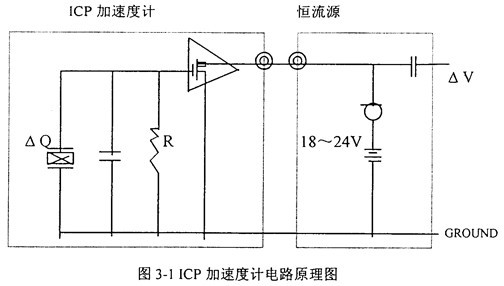 典型的集成壓電式(ICP)加速度計是在傳統(tǒng)的壓電加速度計基礎(chǔ)上耦合一個以場效應(yīng)管為核心的內(nèi)裝放大器電路所構(gòu)成。電路原理如圖3-1所示。ICP加速度計除了能帶來使用方便操作簡化的優(yōu)越性外,較傳統(tǒng)的壓電加速度計還具有如下一系列的優(yōu)點: