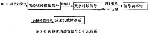 圖3-8是齒輪傳動裝置信號分析流程圖,用HP3562動態(tài)數(shù)字分析儀采集MR-30磁帶記錄儀紀(jì)錄的二級圓柱斜齒輪減速機試驗過程中的模擬信號,可得到齒輪傳動裝置載荷、齒輪傳動裝置箱體動態(tài)激勵力應(yīng)變變化的時域信號,對此信號作FFT變換,可得到載荷譜和動態(tài)激勵力應(yīng)變變化時域信號的功率譜。為了防止功率譜泄露,在作FFT變換時,需作加窗處理,由于試驗采集的是隨機信號,故加漢寧(Hanning)窗處理。利用故障診斷特征參數(shù)一傳動零件可能發(fā)生故障的振動頻率及其振動頻率處的功率對試驗信號進行診斷分析。當(dāng)功率譜所包含的頻率成份難以區(qū)分時,可采用倒譜分析。