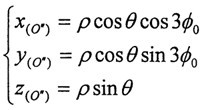 ≈o,cosθ≈1(實(shí)際上p<<L,近似處理是合理的),則可得到三小桿的球面中心P在固定坐標(biāo)系o′X′Y′Z′中的運(yùn)動軌跡: