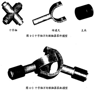當(dāng)前,在工程領(lǐng)域,應(yīng)用美國(guó)PTC公司的CAD軟件Pro/E和美國(guó)MDI公司的動(dòng)力學(xué)仿真軟件ADAMS聯(lián)合進(jìn)行復(fù)雜機(jī)械系統(tǒng)的動(dòng)力學(xué)仿真研究是一種較實(shí)用、較流行的仿真方案。本文的仿真分析中所有模型均是采用這種方案?紤]到建模的注意因素,在用Pro/E建模的過程中,省去了十字軸萬向聯(lián)軸器的許多細(xì)小結(jié)構(gòu),如潤(rùn)滑部分、滾針軸承、彈簧卡圈等,只是保留了十字軸萬向聯(lián)軸器在原理上進(jìn)行傳動(dòng)的必需構(gòu)件和運(yùn)動(dòng)副。在此原則下建立的十字軸萬向聯(lián)軸器的各構(gòu)件模型如圖4-2所示,實(shí)際上只包含十字軸和傳遞叉兩個(gè)活動(dòng)構(gòu)件。建立的十字軸萬向聯(lián)軸器的裝配模型如圖4-3所示。