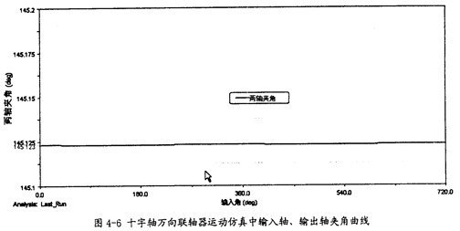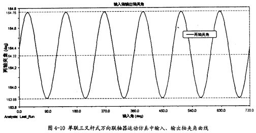 由圖4-10可以知道,輸入軸同輸出軸的夾角在三叉桿式萬向聯(lián)軸器運(yùn)轉(zhuǎn)時(shí)是不斷變化的,在每一個(gè)回轉(zhuǎn)周期中,它的變化頻率為3次,這證明了這種聯(lián)軸器是一種非定心式萬向聯(lián)軸器,同時(shí)在一定的程度上驗(yàn)證了三叉桿式三軸頸的交點(diǎn)以三倍于萬向聯(lián)軸器的轉(zhuǎn)速作圓周運(yùn)動(dòng)的理論的正確性。另外還可看出盡管夾角在不斷變化,但變化非常小,對(duì)兩軸的夾角大小影響很小,本次仿真中夾角大小平均是164.32°(其補(bǔ)角為15.7°,即是第三章中理論計(jì)算中的角度之一)。