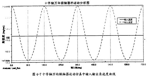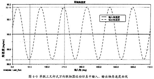 由圖4-9可以知道,當(dāng)輸入軸轉(zhuǎn)速恒定為90o/s時(shí),輸出軸并不作恒速轉(zhuǎn)動(dòng),而是以90o/s為中心,作非常有規(guī)律的周期性運(yùn)動(dòng),在每一個(gè)回轉(zhuǎn)周期中,它的變化頻率為3次。這里的結(jié)果同第三章中的曲線圖3-8也是完全吻合的,因此在一定的程度上也證明了三叉桿萬向聯(lián)軸器轉(zhuǎn)速分析理論的正確性。