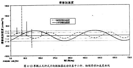 由圖4-13可以知道,在一定的夾角下,小桿在滑道中有滑移加速度同小桿球面中心相對(duì)軸頸的滑移加速度是不同的,前者要大于后者,且它們變動(dòng)的頻率也不一樣,在一個(gè)回轉(zhuǎn)周期中前頻率是1次,而后者2次。此圖中的兩曲線同第三章中的理論分析曲線圖3-13、圖3-14是吻合的,只是小桿滑移的加速度曲線在外形上有差異,仿真的曲線相當(dāng)?shù)钠交、?guī)則,但理論分析曲線卻不規(guī)則,這可能是在計(jì)算中簡(jiǎn)化和省略的原因。盡管如下,這在一定的程度上也證明了三叉桿式萬向聯(lián)軸器理論分析中對(duì)小桿滑移加速度和軸頸滑移加速度這兩項(xiàng)計(jì)算的正確性。(值得說明的是此圖中曲線有時(shí)有突變的現(xiàn)象,主要是考慮到計(jì)算機(jī)的性能,計(jì)算中步長(zhǎng)稍大的原故。在后面的分析曲線中也出現(xiàn)了這樣的情況,將不再作說明。)