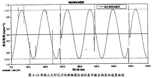 由圖4-21可以看出,雙聯(lián)三叉桿式萬向聯(lián)軸器同單聯(lián)三叉桿式萬向聯(lián)軸器的輸出曲線相似,當(dāng)輸入軸轉(zhuǎn)速恒定時(shí),輸出軸轉(zhuǎn)速呈現(xiàn)有規(guī)律的波動(dòng),在每一個(gè)回轉(zhuǎn)周期中,它的變化頻率為3次,同圖3-8中的β=10°時(shí)的曲線相比,雙聯(lián)同單聯(lián)的情況差不多,故三叉桿式萬向聯(lián)軸器在雙聯(lián)的結(jié)構(gòu)形式下輸出轉(zhuǎn)速特性直觀上無改善。