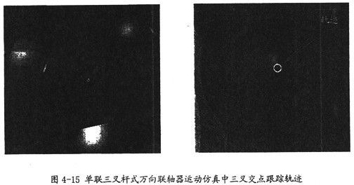 由圖4-15可以看出,在單聯(lián)三叉桿式萬向聯(lián)軸器的運(yùn)動(dòng)仿真中,三叉交點(diǎn)運(yùn)動(dòng)軌跡是一個(gè)圓,相對(duì)于半徑值R(此值的意義見第三章)它的半徑是相當(dāng)小的,這也解釋了為何運(yùn)動(dòng)中兩軸夾角在不斷作微小的變化,同時(shí)也證明了軸頭中心軌跡理論的正確性。