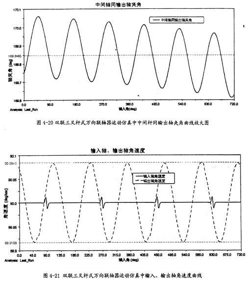 由圖4-20可以看出,中間桿同輸出軸間的夾角變化也呈現(xiàn)一定的規(guī)律,在每-個(gè)回轉(zhuǎn)周期中,它的變化頻率為3次。結(jié)合圖4-19、圖4-20可知中間桿同輸入軸及輸出軸夾角的變化頻率是不-樣的,這是雙聯(lián)三叉桿式萬向聯(lián)軸器有別于單聯(lián)三叉桿式萬向聯(lián)軸器的一種特性。